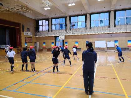 6年1組が体育館でドッジボールをしています。こうして楽しくすごすのもあと少しです。