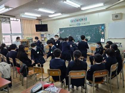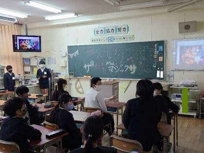 今日の5・6時間目、6年生の卒業茶話会の様子です。マスクの着用や換気など、コロナの感染対策をして、クイズやゲームなど楽しくすごしました。写真は6年1組の様子です。