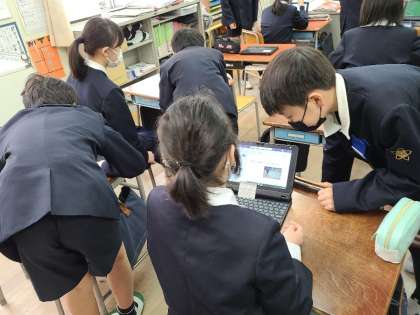 写真上:1組の様子です。体育の様子をビデオで振り返っていました。