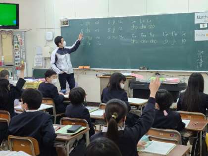 写真下:2組の英語の様子です。tu → tsu などローマ字の書き方の違いについて学習していました。