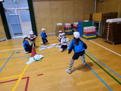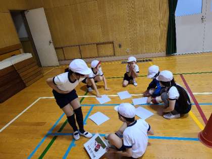 2年1組の体育の様子です。体ほぐし運動遊びの様子です。カードの文字と絵を読み取って、体を動かしていました。