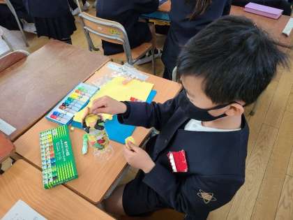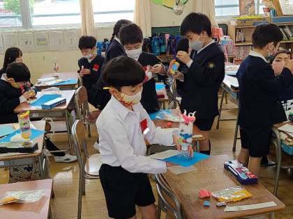 1年生の図工で、パフェを作りました。紙粘土で色づけや工夫したアイスやブルーベリー、マカロンなどを容器に入れて、自分だけの個性あふれるパフェが完成しました。とても美味しそうです。