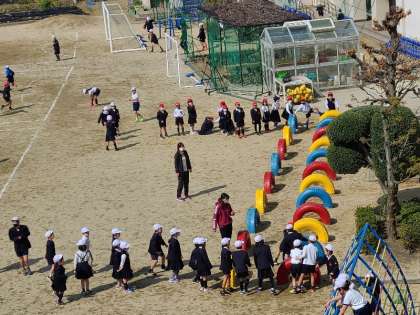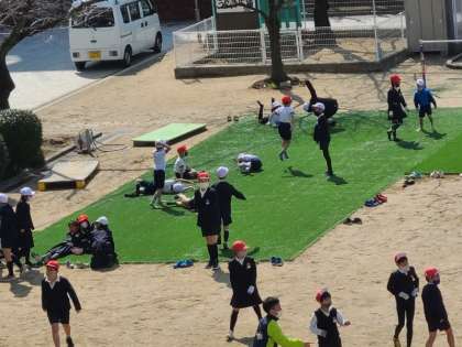 運動場の様子です。天気も良くたくさんの児童が元気よく遊んでいました。