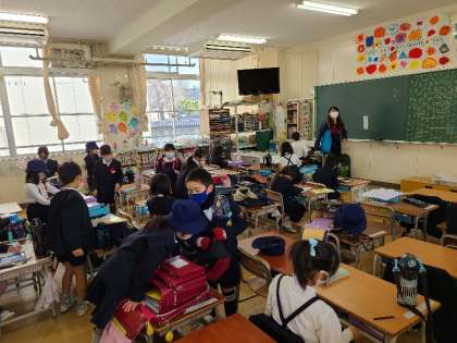 1年1組では、朝の時間に、「友だちになるために」と「校歌」が流れていました。子どもたちはBGMに合わせて歌っていました。