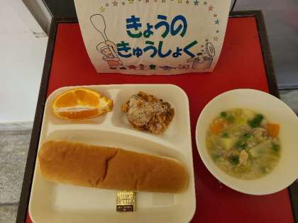 今日の給食は、とうふのミートグラタン、押麦と野菜のスープ煮、デコポン、パン、牛乳です。いただきます。