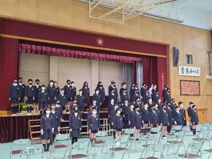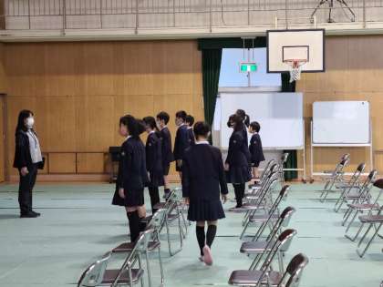 6年生が学年全体で卒業式の練習をしました。入場と卒業生のことばの様子です。