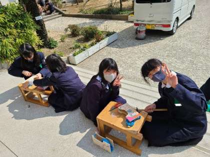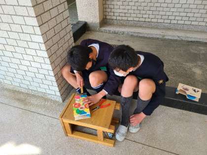 6年2組の図工の様子です。テープカッターを作成しています。釘を打つ音が出るので、体育館前で作業をしていました。