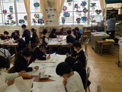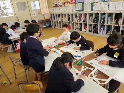 2年2組の図工の様子です。作品袋を作成していました。個性豊かな袋に、この1年間の作品を入れて帰ります。