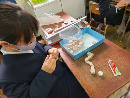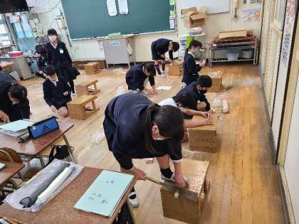4年1組の図工と音楽の様子です。図工では、のこぎりで木材をザクザク切って組み合わせて、個性的な作品を作っていました。