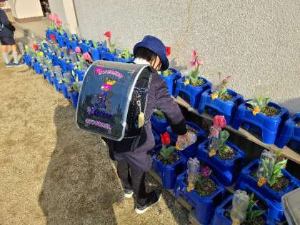 登校後、チューリップにお水をあげています。