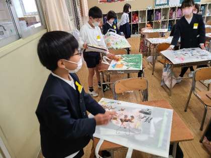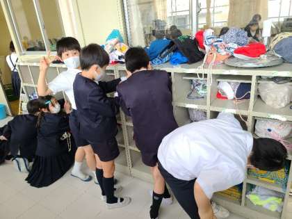 2年2組は、作品袋に1年間の作品を入れていました。3年1組は自分たちが使った教室やロッカー等を掃除していました。教室では椅子の脚の裏まできれいに拭いていました。