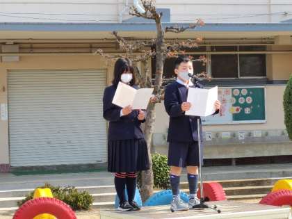 本日、運動場で始業式を行いました。新しいお友だちの紹介、校長先生のお話、新しい教職員の紹介、担任の先生等の発表、6年生の代表による「進級のことば」がありました。