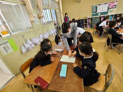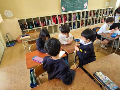 2年生が1年生の「学校たんけん」を案内するために、班で役割を決めています。