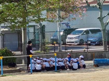 2年2組の体育の様子です。日陰で先生のお話を聞いた後、鉄棒を使った運動遊びをしました。