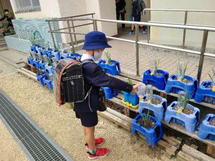 1年から3年生は5時間目で終了です。下校前に、お花に水をあげています。
