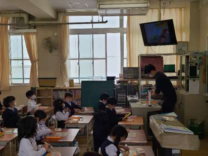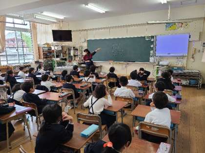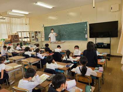 1年生は算数の授業です。算数ブロックの扱い方をタブレットの写真機能でテレビに写し説明していました。