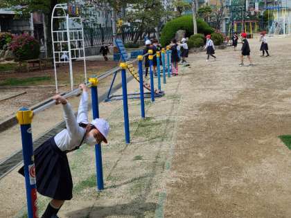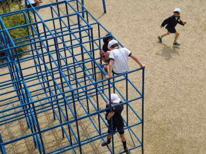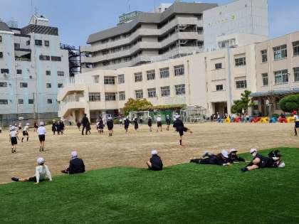 運動場で元気いっぱい遊んでいます。人工芝は、子どもたちの大好きな場所の一つです。