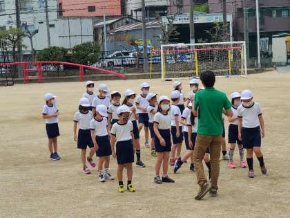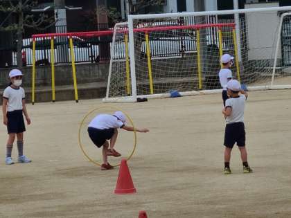 3年2組の体育の様子です。用具を操作する運動で、動いているリングを潜り抜ける運動をしていました。いろいろな動きを楽しんでいました。