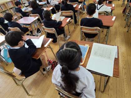 1年生の様子です。写真上は、「心の天気」について説明を聞いています。「心の天気」は、子どもたちがその日の気持ちに最も近いものを、「晴れ・くもり・雨・雷」から選び、タブレットに入力します。天気に基準はありません。これを続けることで、子どもたちの変化に気づき、丁寧に対応していきます。