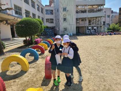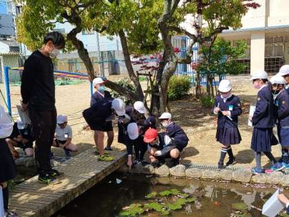 4年2組の理科の様子です。いろいろな場所で、気温や水温を測定していました。