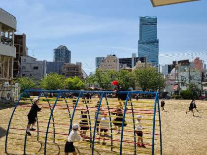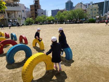 1年生が運動場デビューです。広い運動場でいっぱい遊んでください。