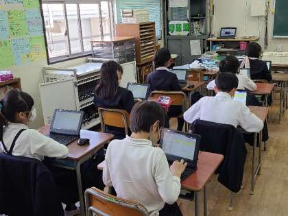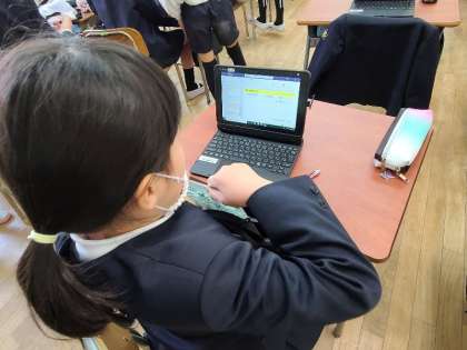4年1組の理科の様子です。タブレットにテキストボックスを作成して、写真や測定をした結果を入力していました。