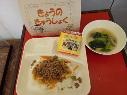 今日の給食は、ビビンバ、トック、いり黒豆、牛乳です。いただきます。