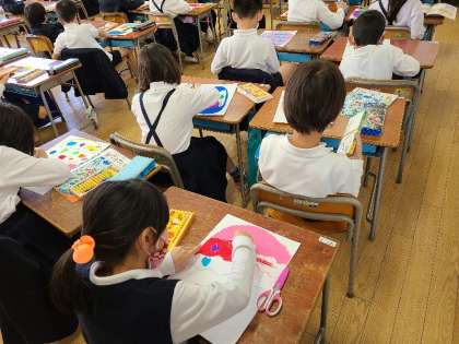 2年1組の図工では、「ふしぎなたまご」という題材で、たまごから生まれてくるものを想像して発想を広げます。何が生まれてくるのでしょうか。