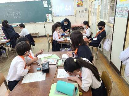 5年2組の英語の様子です。今年もC−NETはルース先生です。互いに紹介しあっています。「先生、この班は、名前にみんなKの文字が入るよ。」と楽しそうに学習していました。