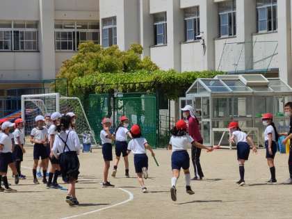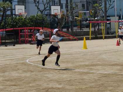 4年1組の体育の様子です。走の運動のリレーの様子です。やはりリレーは応援にも熱がはいります。走る時はマスクは顎にかけて、走り終わるときちんとマスクをしていました。