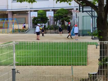 子どもたちが登校後、元気に運動場で遊んでいます。