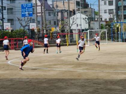 6年1組の体育の陸上運動の様子です。リレーで減速しないでバトンパスをする練習をしていました。「はい」と声をかけて練習していました。