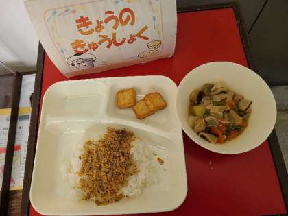 今日の給食は、鶏肉とじゃがいもの煮もの、あつあげのしょうゆだれかけ、紅ざけそぼろ、ごはん、牛乳です。いただきます。