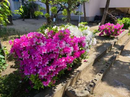 おはようございます。清々しい朝になりました。南門のツツジも陽を浴びて輝いています。