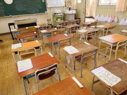 写真下は1年生の教室の様子です。配布物が机上に準備されていました。