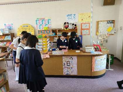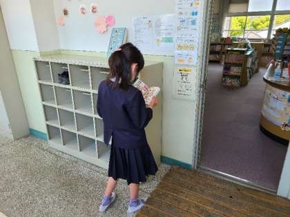 休み時間に図書館を開放しています。図書館に入るのも忘れて、本に集中しています。