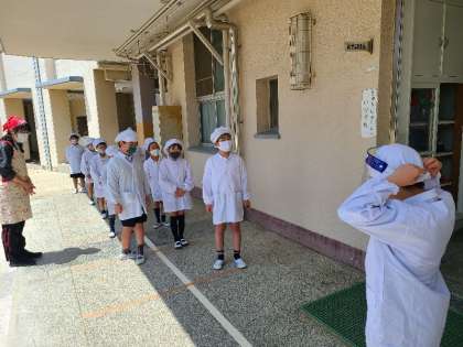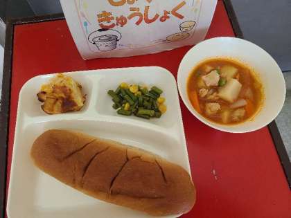 今日の給食は、ケチャップ煮、さんどまめとコーンのソテー、りんごのクラフティ、パン、牛乳です。いただきます。