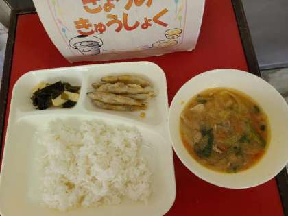 今日の給食は、きびなごのてんぷら、豚汁、わかたけ煮、ごはん、牛乳です。いただきます。