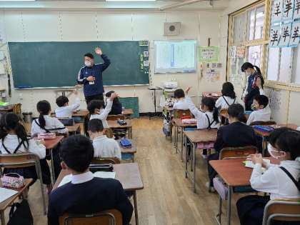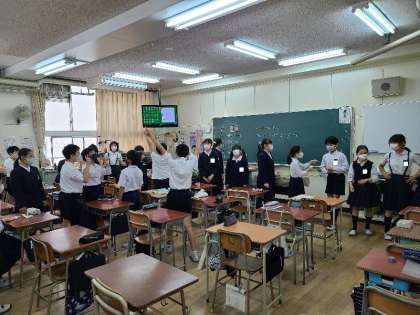 6年1組が授業前のアイスブレイクを行っていました。無言で手振り身振りで、何かを基準にして並んでいました。