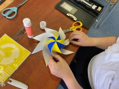 写真上:「何を作ってるの」とたずねると、「こいのぼりにつける風車」と教えてくれました。とても上手にできています。