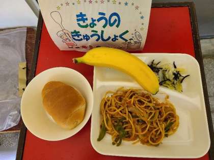 今日の給食は、カレースパゲッティ、キャベツのひじきドレッシング、バナナ、パン、牛乳です。いただきます。