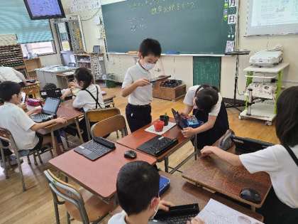4年1組の理科の様子です。ヘチマとひょうたんの葉を観察して、記録していました。