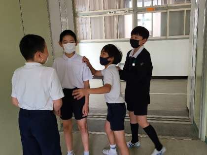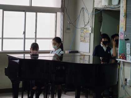 音楽室前のエレベーターホールで、学級活動で発表する出し物の練習をしていました。