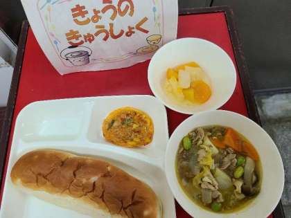 今日の給食は、豚肉と野菜のカレースープ煮、変わりピザ、ミックスフルーツ(缶)、パン、牛乳です。いただきます。
