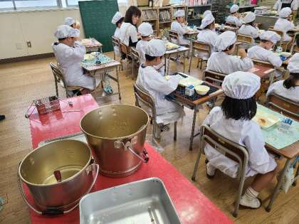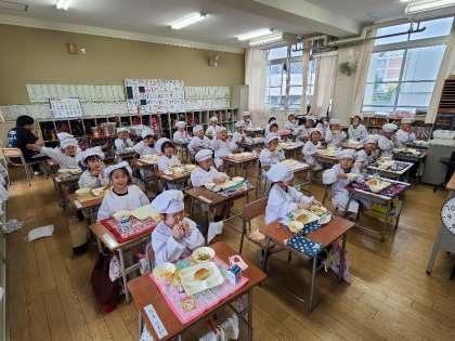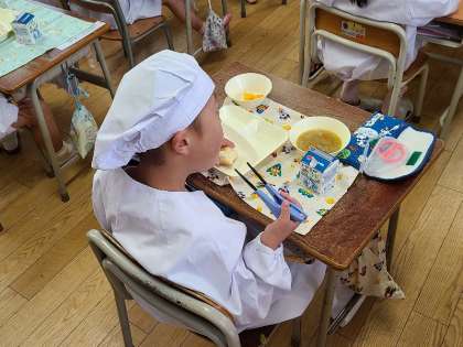 「給食おいしい。」と笑顔を見せてくれました。いっぱい食べてくださいね。