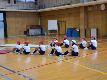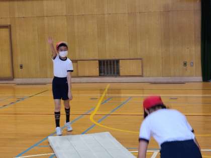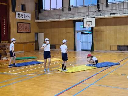 6年2組の体育の様子です。マット運動です。運動が終わると「いいよ」と次の人に合図をして練習をしていました。