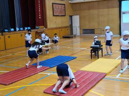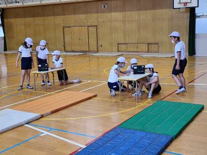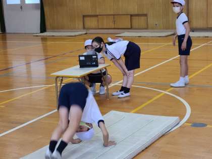 4年2組の体育の様子です。マット運動をしています。タブレットを活用して、自分やお友だちの運動をしっかりと確認できていました。