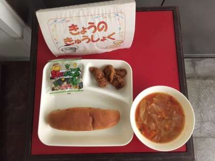 今日の給食は、一口トンカツ、ミネストローネ、豆こんぶ、パン、牛乳です。tいただきます。