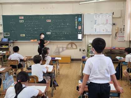 写真上:3年1組の算数の様子です。3けた+3けたのひっ算の求め方をがくしゅうしていました。