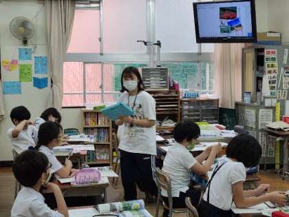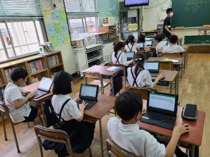 写真中:4年1組の様子です。タブレットでアンケートに応えたり、表を作成していました。